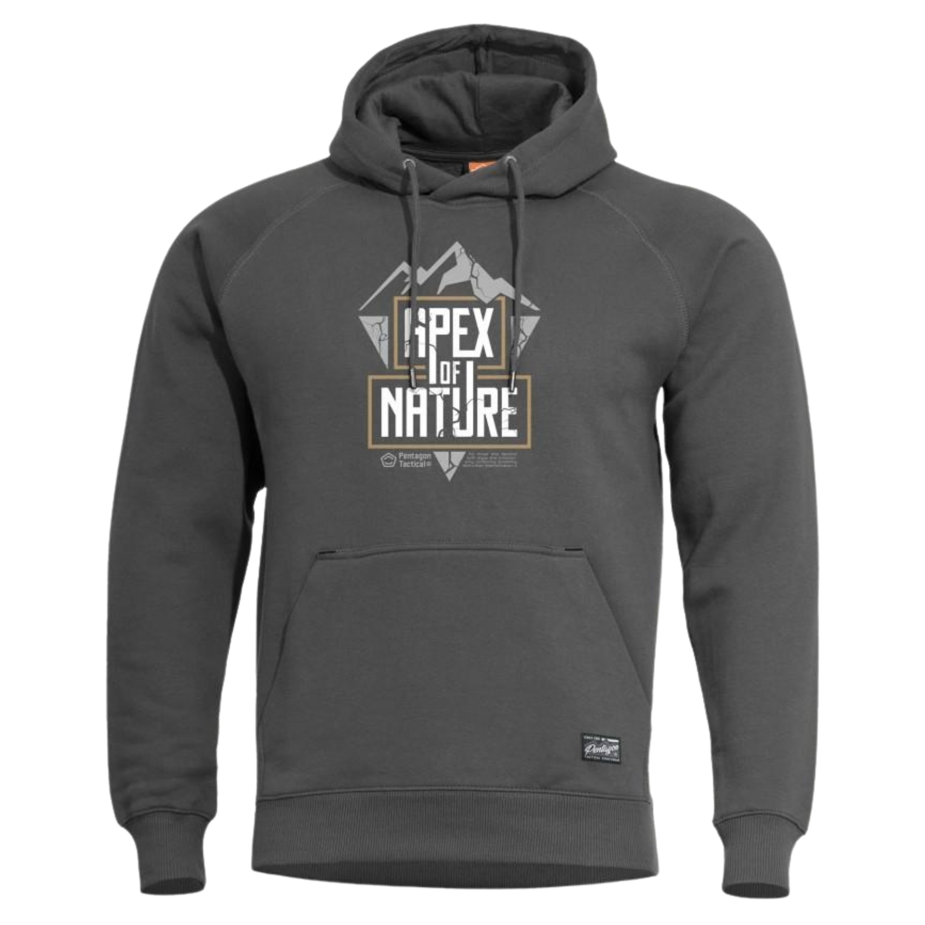 Mikina Pentagon Phaeton Apex Of Nature s kapucňou, ktorá sa dá sťahovať šnúrkami. Mikina je bez zipsu. Na prednej časti sa nachádza priestranné klokanie vrecko. Tento model obsahuje na hrudí nápis Apex Of Nature.