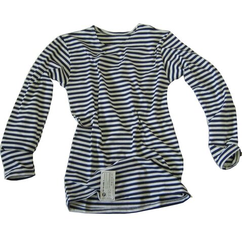 Pásikavé tričko s dlhým rukávom. Toto námornícke tričko má pásiky v tmavo-modrej farbe. Materiál je zo 100% bavlny, avšak jeho štruktúra je riešená systémom dvojitej pleteniny, čím sa zvyšuje trvácnosť tohto materiálu.