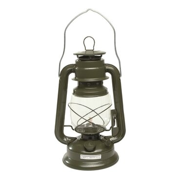 Petrolejová, kerosénová lampa. Ide o lampu s rámom zo zelenej farby.