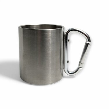 Nerezový pohár s uškom. Vyrobený z nerezovej ocele. Uško je karabína, pohárik sa teda dá pripnuť na batožinu.