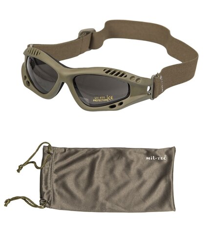 Taktické okuliare s rámom z termoplastickej gumy a očnicami z polykarbonátu. Nastaviteľná guma slúžia ako uchytenie okuliarov na hlavu.