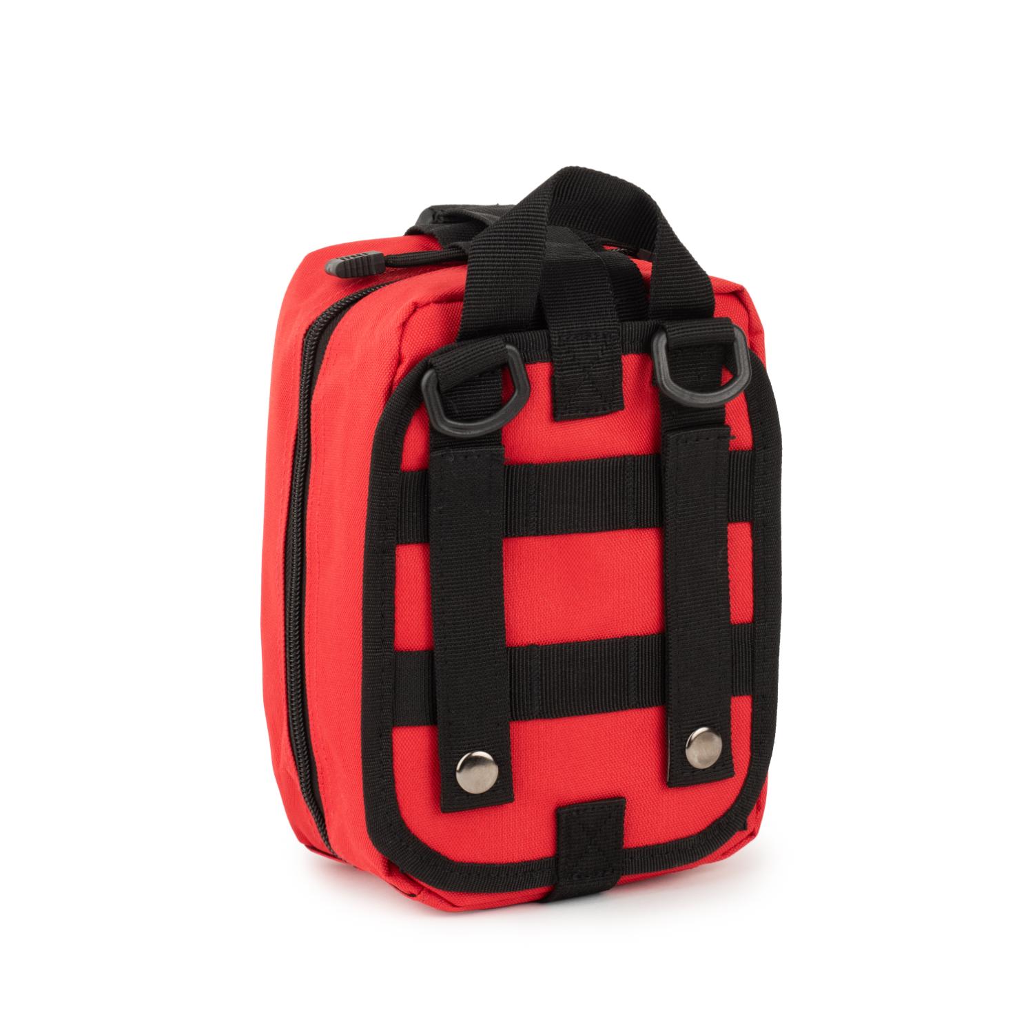 Z prednej časti je velcro panel a na ňom pripevnený velcro patch so symbolom zdravotného kríža. Vnútro kapsičky obsahuje 3 menšie priečinky, 4 elastické popruhy, jednu sieťkovú priehradku.