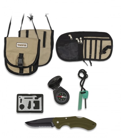 Set viacerých produktov, ktoré môžu byť potrebné pri pobyte v prírode. Obsahuje šnúru na zavesenie na krk.